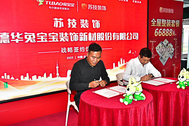 10月19日,中国板材及全屋定制行业标杆品牌兔宝宝与北京家装行业知名企业苏技装饰战略合作签约仪式在京隆重举行。双方企业高管及核心团队成员共同出席仪式,见证这一开启家装产业链全屋定制与家装服务协同发展的重要时刻。此次合作标志着兔宝宝将正式成为苏技装饰核心材料供应及全屋定制战略合作伙伴,双方将整合各自优势资源,在材料供应全屋定制产品供应、板材保障、品质管控、服务升级等领域展开深度合作,共同为消费者打造更具品质感与、环保性的与个性化的全屋定制家装解决方案。