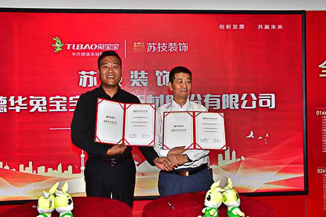 10月19日,中国板材及全屋定制行业标杆品牌兔宝宝与北京家装行业知名企业苏技装饰战略合作签约仪式在京隆重举行。双方企业高管及核心团队成员共同出席仪式,见证这一开启家装产业链全屋定制与家装服务协同发展的重要时刻。此次合作标志着兔宝宝将正式成为苏技装饰核心材料供应及全屋定制战略合作伙伴,双方将整合各自优势资源,在材料供应全屋定制产品供应、板材保障、品质管控、服务升级等领域展开深度合作,共同为消费者打造更具品质感与、环保性的与个性化的全屋定制家装解决方案。